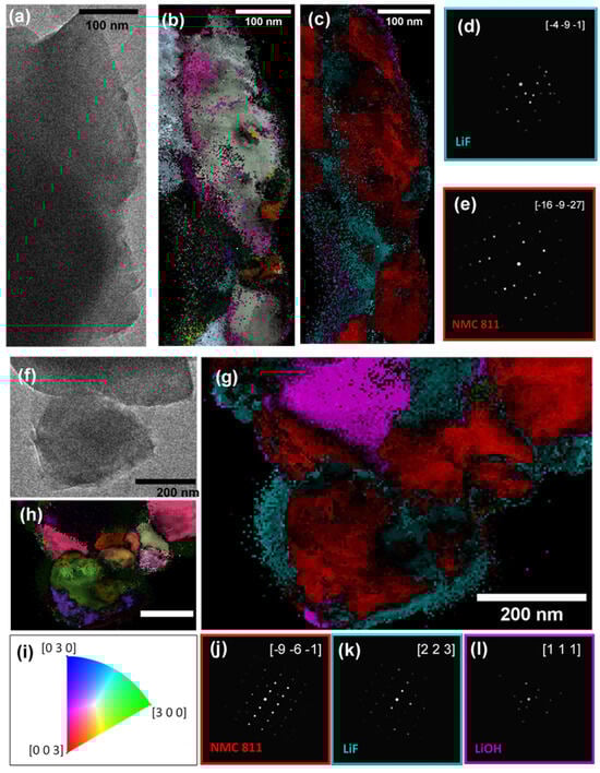 Regarding zone 2, the orientation mapping revealed a polycrystalline structure (Figure 3h). This finding was corroborated by TEM (Figure 3g) and STEM-HAADF (Figure 2a) imaging, which did not indicate particle superposition, thereby confirming the polycrystalline nature of the primary particles. This supports the theory of LiF layer instability due to mechanical disruption, as previously discussed. Figure 3k illustrates the uneven spatial distribution of LiF around the particle edge, mirroring observations in zone 1. Additionally, LiOH was detected in this area with high phase and orientation reliability (Figure 3l), yet it was notably absent from the particle edges.
