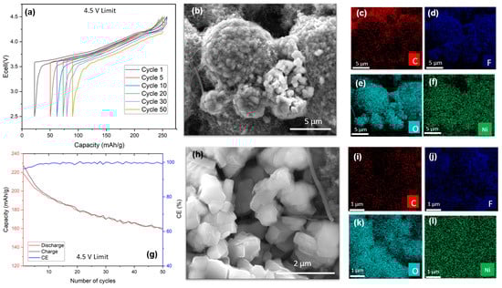 Figure 4. (a) Potential vs. capacity electrochemical curve of cycled NMC 811 at the voltage limit of 4.5 V. (b) Secondary electron (SE) image of NMC 811 secondary particles in the cathode sheet after cleaning (4.5 V-limit cell). EDX analysis for elemental identification of (c) carbon, (d) fluorine, (e) oxygen, and (f) nickel. (g) Charge and discharge lost and CE in the function of the number of cycles on the NMC 811 coin cell. (h) Secondary electron (SE) image of NMC 811 single secondary particles in the cathode sheet after cleaning (4.5 V-limit cell). EDX analysis for elemental identification of (i) carbon, (j) fluorine, (k) oxygen, and (l) nickel.