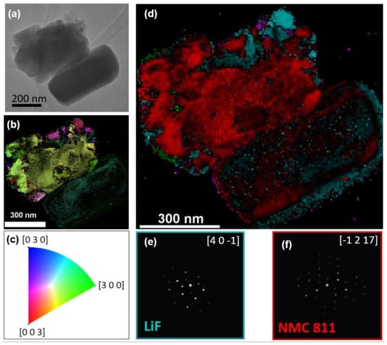 Figure 6. The 4.5 V sample. (a) TEM image of 4.5 V-limit primary particles, (b) 4D-STEM analysis of primary particles: reliability map and orientation map superposition, (c) orientation color map, (d) 4D-STEM analysis of primary particles: phase map and phase reliability map superposition, (e) diffraction pattern (DF) for LIF (blue) component, and (f) DF for NMC 811 component (red).
