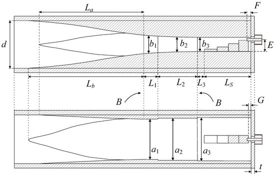 The adapter’s dimensional parameters, shown in Figure 2, are optimized using the simulation tool. In designing the coaxial-to-rectangular waveguide transformer, the length, height and thickness of the stepped-ridge converter S, the dimensions of the matching cavity M and the diameter and length of the probe hole H have been optimized using CST Studio SuiteTM V2023. The lengths L1, L2, L3; widths a1, a2, a3; and heights b1, b2, b3 of the waveguides R1, R2 and R3, respectively, have also been optimized. For the rectangular-to-circular waveguide transformer T, this paper has applied a smooth spline taper with its length La and Lb set as control parameters. La and Lb are the length of the taper from the rectangular waveguide’s broad (starting from A and B) and narrow walls to the circular waveguide, respectively. The taper shape is of the spline type provided by CST Studio SuiteTM V2023 with smoothness control applied.