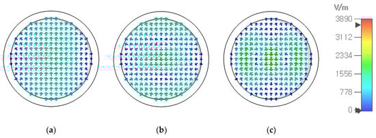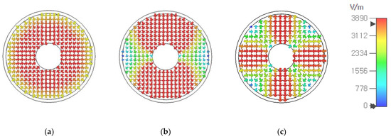 Electric fields at 50 GHz in the coaxial cable C in (a) TEM mode, (b) TE11 mode and (c) TE21 mode.