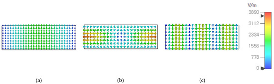 Electric fields at 50 GHz in the rectangular waveguide R3 in (a) TE10 mode, (b) TE11 mode and (c) TE30 mode.
