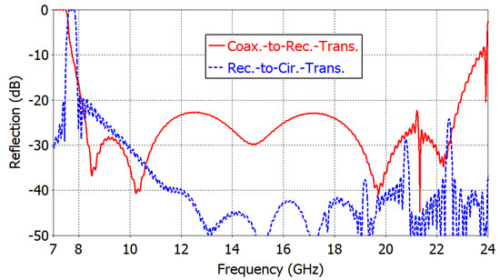 Figure 6 shows the reflection coefficient from the time-domain analysis of the coaxial-to-rectangular waveguide transformer and the rectangular-to-circular waveguide transformer. The lengths La and Lb of the rectangular-to-circular waveguide transformer are made sufficiently large so that the reflection coefficient is less than −20 dB at 8–24 GHz. Local peaks due to higher-order mode excitation occur at 19.18, 20.87 and 22.46 GHz. The coaxial-to-rectangular transformer is optimized for reflections < −20 dB at a 8–23 GHz frequency range. A local peak is observed at 21.25 GHz. The reflection coefficient of the final combined structure will closely follow that of the coaxial-to-rectangular waveguide transformer.