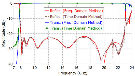 Reflection and transmission coefficients from the time- and frequency-domain analyses of the proposed adapter.