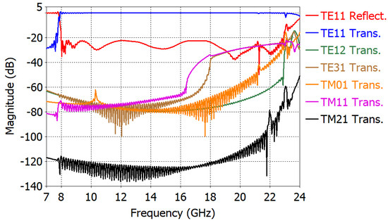 In any adapter, higher-order modes need to be sufficiently suppressed. Figure 8 shows the coefficient of transmission from the coaxial TEM mode to the fundamental TE11 and higher-order modes in the output circular waveguide along with the reflection coefficient of the TE11 mode. Compared to the level of the dominant TE11 mode, the higher-order mode level is less than −25.0 dB at the operating frequency range of 8.00–22.95 GHz. Above 22.95 GHz, the level of higher-order modes is greater than −25 dB. In Figure 8, the TM11 mode level is the largest, ranging from −40 dB to −25 dB at 17–23 GHz. The next largest mode is the TE31 mode, ranging from −40 dB to −25 dB at 18–23 GHz. The TM01 mode steadily increases from −60 dB at 20 GHz to −20 dB at 23 GHz, while the TE12 mode is less than −40 dB up to 23 GHz.