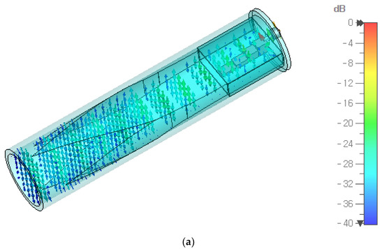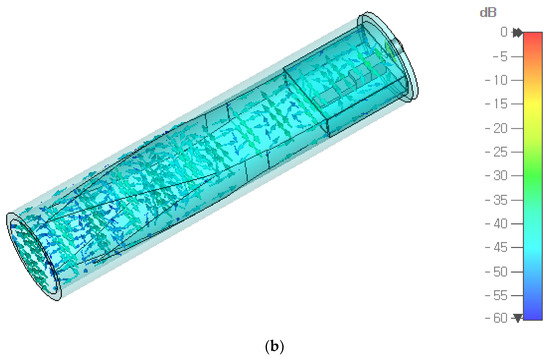 Figure 9 shows the electric and magnetic fields of the dominant mode inside the adapter at 15 GHz. The peak values of the electric and magnetic fields are uniform along the wave propagation direction, indicating a small voltage standing wave ratio (VSWR) and thus a good impedance matching performance.
