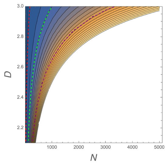 Contour plot of from Equation (23) as a function of N and D. The white excluded region represents . Colored dashed lines correspond to (red), 10,000 (green), and 50,000 (purple).