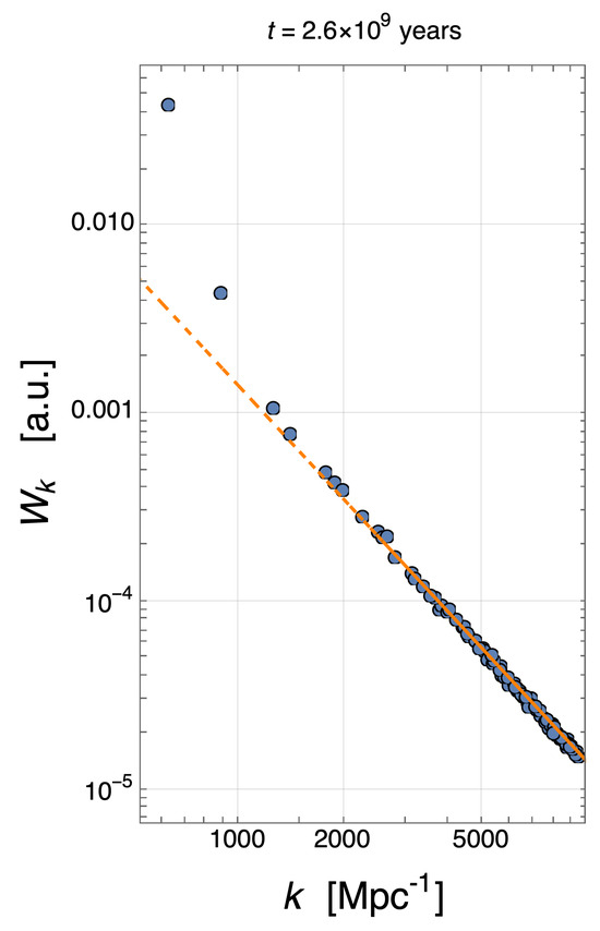 The energy spectrum was obtained using the quantity , where the definition held and averages over equal values were implemented. In Figure 2, we plot at a fixed time evolved from an initial condition in which three modes were non-zero and their wavenumbers were taken in the ratio corresponding to , i.e., . We clearly see that the energy was mainly concentrated in the first two modes, while the remaining part of the spectrum rapidly decayed as . This was the result of the so-called condensation phenomenon, which is well-known in fluid dynamics [12]: while a direct cascade of enstrophy was observable and it corresponded to the profile (see [54] for a detailed discussion), an inverse cascade of energy produced the lowest k values. This scenario, when referred to the cosmological setting, clarifies why we reliably apply the fragmentation due to eddy vorticity to two spatial scales only: de facto clusters of galaxies and galaxies. In other words, we propose the idea that the fractal turbulence of the baryon fluid can play a role in structure formation, but its fingerprint can concern the formation of galaxies only and, in this sense, observational evidence of fractality could be recovered at this spatial scale of the Universe.