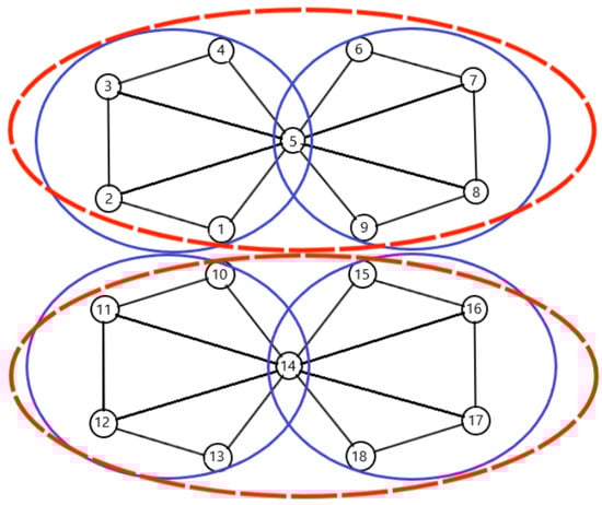 Simple undirected graphs with two layers of communities when and . The first layer of communities corresponds to the set of nodes surrounded by thin blue solid line ellipses. The second layer of communities corresponds to the set of nodes surrounded by the red thick dashed line ellipse.