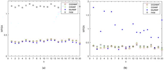 Take as an example. MRSA visualization plots of DSSNMF and the three comparison algorithms run 20 times on synthetic data when , , and . The numerical results are shown in Figure 1. The x-axis of Figure 2 refers to the s-th experiments. (a) The first layer of factorization. (b) The second layer of factorization.