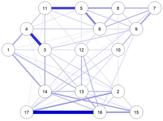 The symptom network for the PTSD dataset was constructed in R, and regularized estimation of a partial correlation network was performed using extended bayesian information criterion (EBIC) [] selection. The full R code for this analysis can be found in the supplementary material to the literature []. The visualized symptom network is shown in Figure 3.