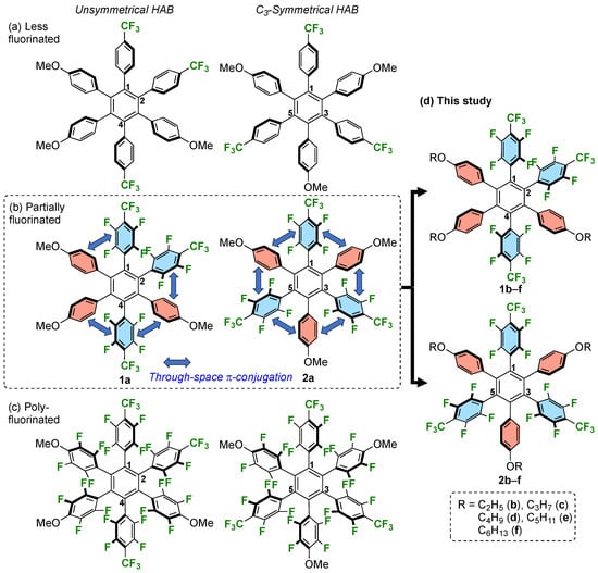 Research concept and chemical structures of (a–c) various hexaarylbenzenes reported in our previous studies [12] and (d) partially fluorinated hexaarylbenzenes, e.g., 1b–f and 2b–f, with a various length of alkoxy chain used in this study.