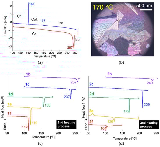 (a) DSC thermogram of unsymmetrical 1b in the second heating and cooling processes, and (b) POM texture image at 170 °C during the cooling process. (c,d) DSC thermograms of 1b–f and 2b–f during the second heating process and melting temperature.