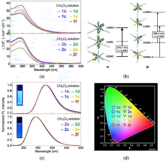 We investigated the photophysical behavior of unsymmetrical 1b–f and C3-symmetrical 2b–f compounds in solution. A solution sample was prepared by dissolving each compound in dichloromethane (CH2Cl2) and adjusting the concentration to 1.0 × 10−5 mol L−1. Figure 3 depicts the absorption spectra of unsymmetrical 1b–f and C3-symmetrical 2b–f in CH2Cl2 solution, theoretical electronic transitions in absorption behavior calculated from quantum chemical calculations [17,18,19], PL spectra, and a color diagram defined by the Commission Internationale de l’Eclailage (CIE) to visually represent the emitted PL color. The obtained photophysical data are summarized in Table 2.