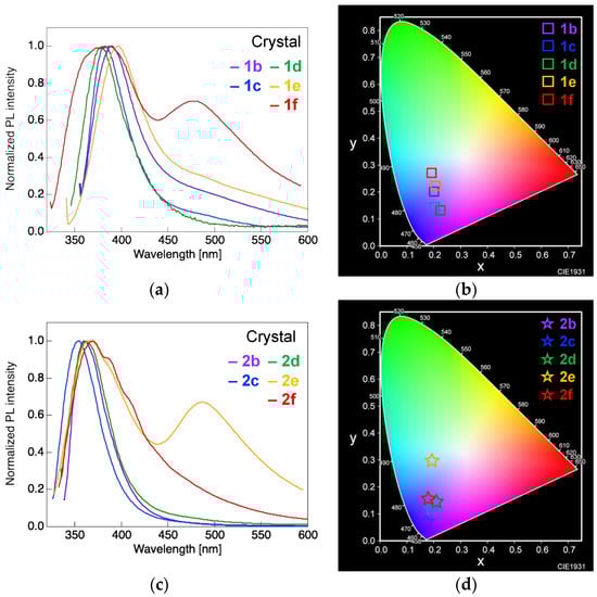 Our next interest was directed toward the PL behavior of unsymmetrical 1b–f and C3-symmetrical 2b–f in the Cr states. The Cr samples were purified using column chromatography and recrystallization. Figure 4 depicts the PL spectra and a CIE diagram that visualizes the PL color. The observed photophysical data are summarized in Table 4.