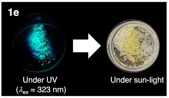According to the PL spectral shapes shown in Figure 4a,c, in addition to the PL bands on the short-wavelength side, PL bands or broad shoulder peaks were observed in the long-wavelength region. This phenomenon was also observed visually, and when a white crystal sample of 1e was irradiated with 323 nm excitation light, it turned yellow (Figure 5).