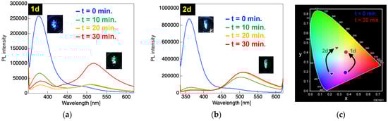 The observed phenomenon is photochromism in the crystalline state, which causes a color change when irradiated with light [20,21,22], however, to our knowledge, there are only limited reports on fluorinated photochromism materials [23,24]. Partially fluorinated HABs are considered novel crystalline photochromic molecules. To learn about the crystalline photochromism of partially fluorinated HABs, we investigated the PL behavior of the sample and the changes in the PL behavior depending on the UV irradiation time using crystals of unsymmetrical 1d and C3-symmetrical 2d with a butoxy chain and 1f and 2f with a hexyloxy chain as representative examples. Figure 6 depicts the PL spectra and color changes before and after UV irradiation.