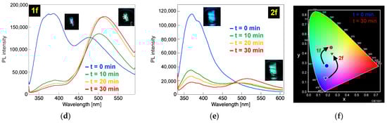 PL behavior of a recrystallized sample (t = 0 min) and after UV irradiation time (t min) for (a) 1d (λex = 335 nm) and (b) 2d (λex = 319 nm). (c) PL color change of 1d and 2d before and after UV irradiation. PL behavior of a recrystallized sample (t = 0 min) and after UV irradiation time (t min) for (d) 1f (λex = 307 nm) and (e) 2f (λex = 316 nm). (f) PL color change of 1f and 2f before and after UV irradiation.