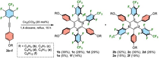 Synthesis of unsymmetrical fluorinated HABs 1b–f and the C3-symmetrical analogs 2b–f using unsymmetrical partially fluorinated tolanes 3b–f via a cobalt-catalyzed [2 + 2 + 2] cyclotrimerization.
