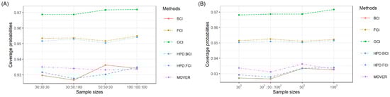 CPs for the 95 % SCI derived using the various methods for various sample sizes in the cases of (A) and (B) .