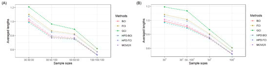 ALs for the 95% SCI derived using the various methods for various sample sizes in the cases of (A) and (B) .
