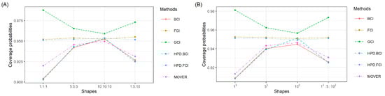 CPs for the 95% SCI derived using the various methods for various parameter shapes in the cases of (A) and (B) .