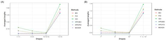 ALs for the 95% SCI using the various methods for various parameter shapes in the cases of (A) and (B) .