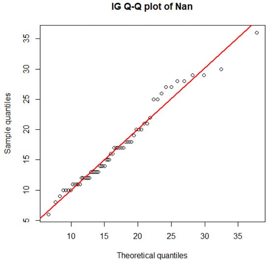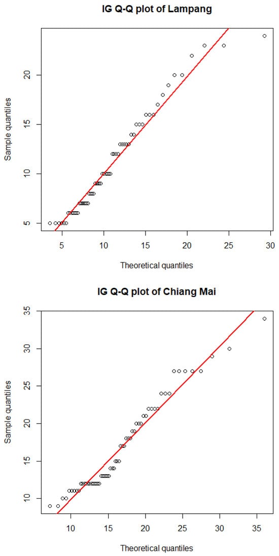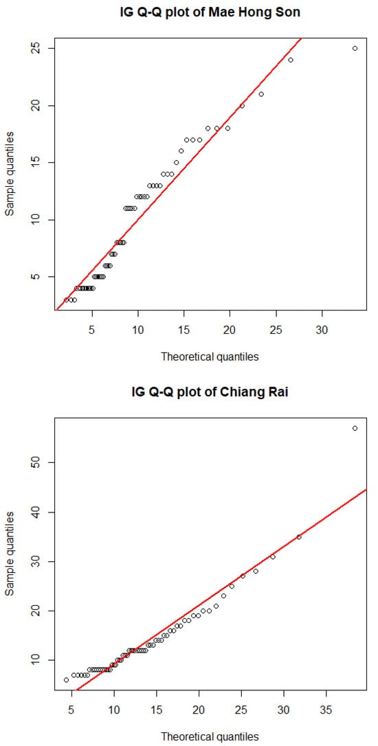 The AIC and BIC results in Table 5 and Table 6, respectively, indicate that the positive values observed in the datasets from the five provinces adhere to the characteristics of an IG distribution. The AIC and BIC values of the inverse Gaussian distribution and the lognormal distribution were not significantly different because both distributions are based on the right-skewed characteristic. In this situation, the model for the inverse Gaussian distribution was considered to be the best due to it providing the lowest AIC and BIC values. Furthermore, the quantile–quantile (Q-Q) plots for the IG distribution confirm this finding in Figure 5.