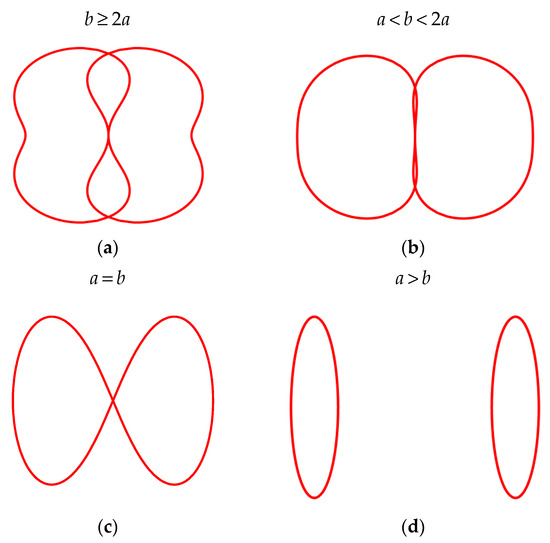 As shown in Figure 1, Cassini ovals have four characteristic shapes that depend on the ratio between and . If , the Cassini oval is a convex curve (Figure 1a), like an ellipse. If , then in the Cassini oval, there is a concave jumper (Figure 1b). If , then the jumper closes, and the Cassini oval turns into a figure resembling an inverted 8 symbol (Figure 1c). This curve is known as the lemniscate Bernoulli. If , the Cassini oval breaks up into two independent figures (Figure 1d).