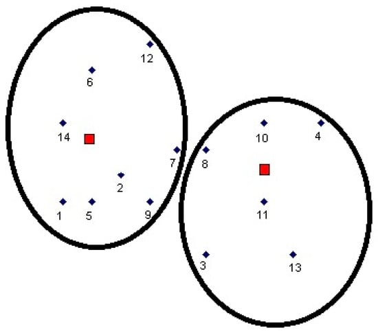 To test the potential of Cassini ovals for clustering purposes, a sample of artificial data with 14 points was proposed [22]. This dataset was used to illustrate the potential of utilizing clustering for working with Cassini ovals. The coordinates of the points are provided in Table 1.