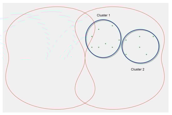 In the third section, we assumed that all the data points (objects) were in one cluster. Of course, this is a trivial case because the number and structure of the objects could be different. If, for example, the radar detects balloons and drones, then two clusters would be obtained in the clustering result, one of which would contain the projections of the balloons and the other one would have the projections of drone coordinates (Figure 12).