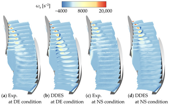 Time-averaged streamwise vorticity of different conditions. (a) Experimental result at the DE condition; (b) DDES result at the DE condition; (c) experiment result at the NS condition; (d) DDES result at the NS condition.