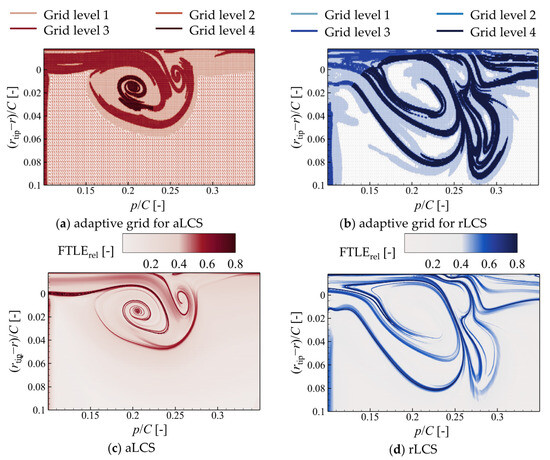 The increasing initial grid points result in more distinct LCSs and higher computation costs simultaneously. Adaptive meshes are generated based on the FTLE fields from grid-1 to balance the calculation accuracy and costs. Regular grid points of four different densities are used to seed at different regions with various FTLE ranges and are particularly refined inside the TLV core, as shown in Table 3. Then, these seeding points are triangulated into the unstructured grid. As the grid density near the ridges stays nondecreasing, the grid numbers of the adaptive grids reduce to 27.5% and 82.7% of the grid-2 for the FTLE field of negative and positive integration time, respectively. The sketch of the adaptive grids and contours of the FTLE fields are shown in Figure 4. With the adaptive grids, the ridges are further clarified, while the general LCSs stay the same. In the core region of the TLV, where the radius of curvature of the ridges is small, the detailed aLCSs are captured with the higher-density grid. For the rLCSs, the decrement of the total grid points of the initial grid is not significant, as the structures are complicated.