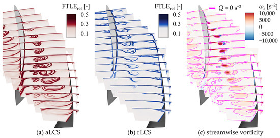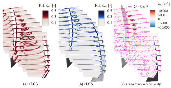 The FTLE and vorticity fields of the time-averaged flow fields in the DE and NS conditions are shown in Figure 6 and Figure 13, respectively. The Eulerian Q criterion is applied, and the isolines of Q = 0 s−2 are shown in Figure 6c and Figure 13c, along with the vorticity field. For the time-averaged flow field, the aLCSs are similar to the TLV structure identified by the Q criterion, while the correlativity between the rLCS and the vortex structures seems weak. The region enclosed by the aLCS and the rLCS covers the TLV. In our previous study [55,56], the evolution of the TLV was divided into three phases, namely the generation phase, the development phase, and the dissipation phase. In the first two phases, the LCSs are clear, while, as the flow travels downstream, the TLV steps into the dissipation phase. In the first stage of the dissipation phase, the TLF jet shears across the passage flow and rolls up together as the secondary TLV (STLV). This structure can be confirmed by the aLCS, as clear ridges between the TLV and the STLV indicate two separate vortex structures. Then, the TLV breaks down. For the Eulerian Q criterion, the vortex structures it identified become unrecognizable. Meanwhile, for the LCSs, the aLCS gives the boundary of the passage flow entrainment.