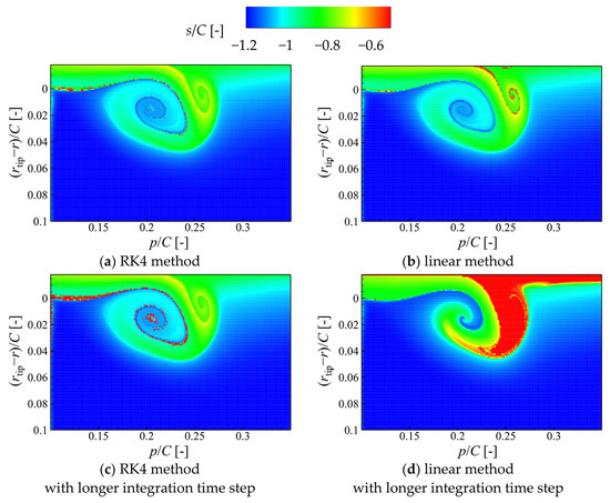 Figure 9 shows the final streamwise position of the particle with different time integration methods. When applying the time integration in a negative time direction, the ridges of the TLV and IV are related to two regions of large particle separations, respectively, with one being near the shear layer at the blade tip, while the other is near the shear layer at the shroud. For an axial rotor, the blade is relatively thin, and the clearance is small. However, the flow inside the gap is complex, featuring vortex structures and jet flows. When particles advect to the gap, a large time interval may lead them to pass the gap within a few integration steps, and thus, it is difficult to capture the flow features inside the gap. The RK4 method performs better than the linear method in tracking the particles inside the gap and thus gives a more stable structure of the LCSs.