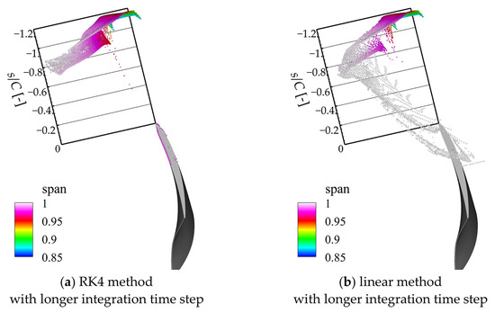 Figure 10 shows the 3D view of the final position of the particles with different time integration methods with an integration time step of 20 Δt. The differences in the final positions of the particles between the two methods mainly exist in the particles that have passed the blade gap. For the linear method, a great part of the particles is finally located near the shroud. The particles near the shroud tend to be trapped in the shear layer at low speed or hit the shroud and stop. With a longer time step length, the particle trajectories further deviate with time-advecting, and the general LCSs are altered.