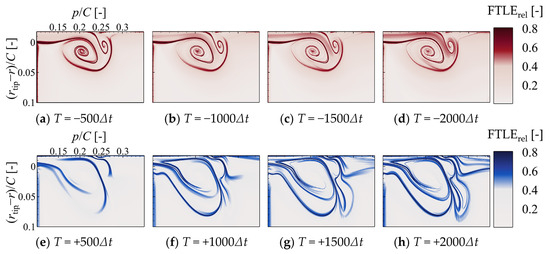 The LCSs of a series of integration times, both negative and positive, and the time direction of the time-averaged flow field at the DE condition. (a) Integration time of T = −500 Δt; (b) integration time of T = −1000 Δt; (c) integration time of T = −1500 Δt; (d) integration time of T = −2000 Δt; (e) integration time of T = +500 Δt; (f) integration time of T = +1000 Δt; (g) integration time of T = +1500 Δt; (h) integration time of T = +2000 Δt.