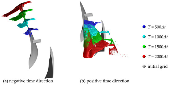 The integration time (T) is another critical factor for the LCSs, as it determines the final position of the particle. The LCSs of a series of integration times for both negative and positive time directions are shown in Figure 11, and the corresponding final particle positions are shown in Figure 12. For the negative time direction, the particles transport ahead of the blade row where the flow is relatively undisturbed, and the general structures of the aLCSs are similar. In the positive time integration direction, the particles are transported downstream and entrained into different vortex structures, or even into the gap of the adjacent blade. Thus, more rLCSs emerge with the increase in the integration time. In this rotor, the period of a rotor blade passing through one pitch is about 1000 Δt, and the period of a particle passing through the blade row is about 1500 Δt. As the integration time length exceeds 1000 Δt, the primary LCSs tend toward stability.