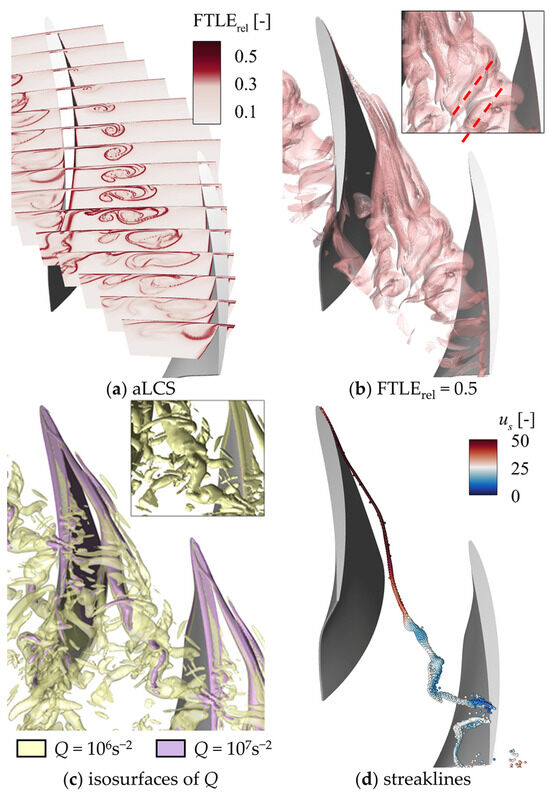 The 3D LCSs of two instantaneous flow fields with the DE and NS conditions are shown in Figure 15 and Figure 16, respectively. The aLCSs at different streamwise cross-sections are shown in (a), the aLCS isosurfaces of FTLErel are shown in (b), the isosurfaces of Q are shown in (c), and the snapshots of the streaklines releasing along the TLV core are shown in (d) for both working conditions. A streakline is formed by continuously releasing fluid particles at a fixed point and observing the trajectories that the fluid particles reach over time. In this study, the streaklines are constructed by releasing particles along the TLV core at continuous time intervals of 10 Δt. The particle release begins from the initial sampled flow field, with particles advecting downstream with an integration time step of 10 Δt using the RK4 time integration method. The integration method is consistent with the LCS calculations. Compared to the aLCS in the time-averaged flow field, the differences are caused by the unsteadiness of the flow. The breakdown of the TLV features a characteristic unsteady flow structure in this rotor, and the breakdown patterns are different in the DE and NS conditions. Only the spiral breakdown pattern of the TLV exits at the DE condition, while the spiral and bubble breakdown patterns of the TLV appear alternately at the NS condition.