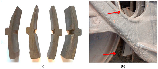 Clinodual wear of a CBP: (a) pads removed from a wagon with large remaining working mass; (b) overtime clearances between the “pad–wheel” tribotechnical pair.