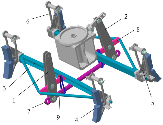 A model of a brake lever transmission system of a two-axle wagon with brake pads: 1, 2—vertical lever; 3—triangle; 4—brake pad; 5—pad holder; 6—pendulum suspension; 7—delimiter of clearance; 8—spacer triangle; and 9—bracket with a lock (a device for uniform pad wear).