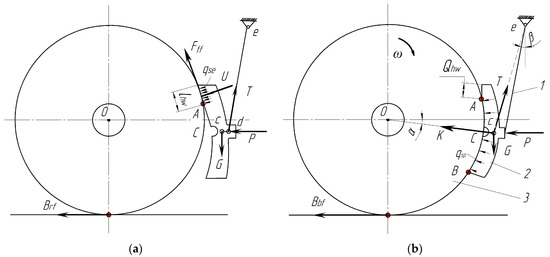 Due to the self-weight design of the brake system parts, there is a gravitational force, G (Figure 3a), under the influence of which the brake pad tilts by turning the kinematic node, d, around until it is pressed by the force, U, with a value of 150 N to 200 N against the rotating wheel [10]. At the same time, the parameter, d, was obtained from the design and technological documentation for the brake lever transmission system. With the increase in frictional wear, an area of harmful abrasion, Qhw, is formed. The force, U, is distributed on this plane by the specific force, qse. Under the action of such forces, the friction force, Fff, is formed, and the force of resistance, Brf, to the rolling of the wheel arises and is realized during the wheel/rail contact.