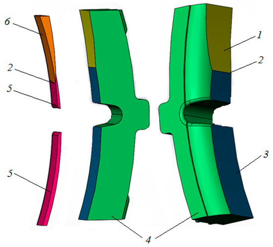 A 3D model of the CBP with clinodual wear: 1—harmfully worn pad surface; 2—a line of separation of planes; 3—a plane of brake (working)-pad wear; 4—a block body; 5—the result of brake wear; and 6—the result of harmful wear.