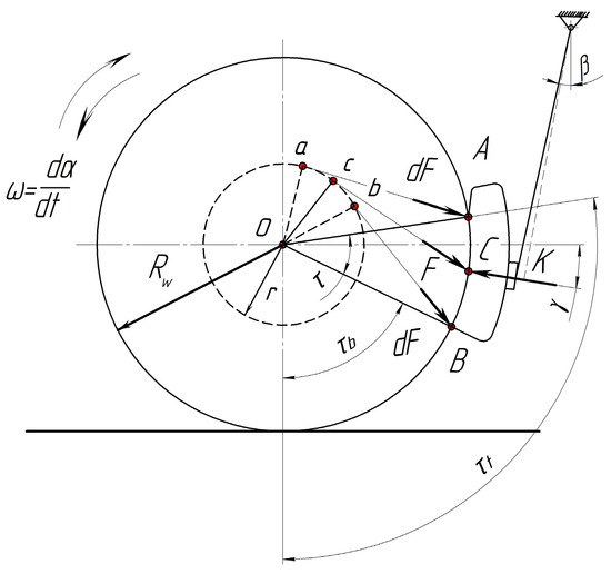 According to the assumptions presented in the work [52], all considered forces should lie in the cross-sectional plane of the block, which coincides with the plane of the figure [50] (a scheme in Figure 6), and the lines of action of the forces, dF (in the sector, τ, coverage of the wheel by the pad) practically converge to the point, c, of the circle with radius r [52]: