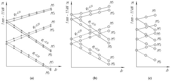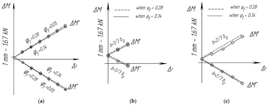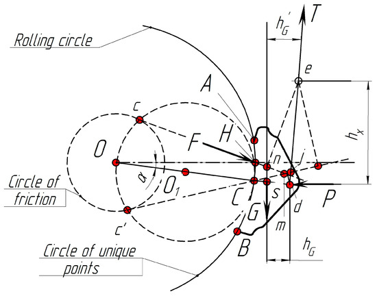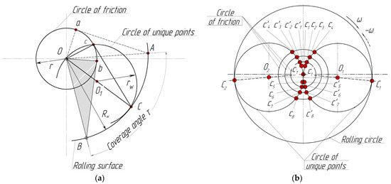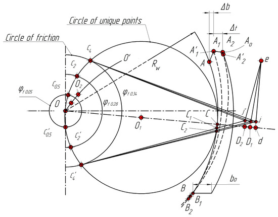 Figure 6a shows a scheme of construction of unique points. It can be seen that a triangle, ΔOBb, can also be connected to its equal triangle, ΔOCc, by turning to an angle (τt − τb)/2. The angle is a straight line, and the straight line, |cC|, is tangent to the friction circle. Therefore, the point, c, can be observed as a point of an intersection of the friction circle with the circle built on the axis as on the diameter. This circle is a circle of unique points that change their location due to changes in the friction coefficient, φf.