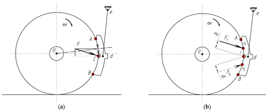 Let us present Equation (11) in a slightly different form, . It is not difficult to notice that the main vector of the sum of forces G, P, and T (force F) also passes through point H. This point to some extent characterizes the distribution of forces dF on the surface of the CBP and also determines its wear. This means that the nature of pad wear depends on its location on the contact, ∪AB. Therefore, point H is called the center of the wear of the brake-pad working surface.