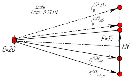 The following values of friction coefficients of a friction pair were considered: φf = 0.05; φf = 0.28; and φf = 0.34. For the clarity and simplicity of the description of the procedure of determining unique points (for different φf), the calculation-graphical method of constructing polygons of forces acting on of quasistatic-equilibrium objects was applied.