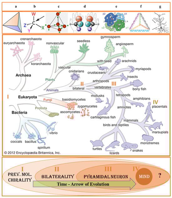 Biological evolution from the biochirality perspective. A broad view of biological symmetry assumes that chirality transfer from the molecular to macromolecular and cellular levels plays a vital role in human physiology underlying perceptual and cognitive function linked with bilateral organisms’ emotional and behavioral expression. Biologists have made long-term efforts to explain the common origin of the homochiral world of DNA code and protein sequence, resulting in the emergence of the human mind. Quite unexpectedly, for many scientists, it was realized that the Ariadne thread is the concept of symmetry []. On the other hand, all theories ignoring the symmetry principle proved to be irrelevant. Indeed, the evolutionary history of life exhibits the chain of successive events (chain of chirality transfer) linked by the apparent common association with the notion of symmetry. The four most significant are indicated in Figure 1. Events I, II, and IV are the scientists’ long-term concerns. The appearance and evolution of PyrNs (event III) attract increasing attention but do not focus on the specific geometric shape of soma. (Top). Transfer of symmetry constraints from molecular to cellular level. (a) Tetrahedron—geometrical shape that can be transformed from chiral to achiral version. (b) Tetrahedral (sp3-hybridized) carbons with four different substituents are the principal components of biological molecules exhibiting homochirality. (c) Tetrahedral structure of water forming about 70% of cytosol. (d) L/D amino acids. (e) Tetrahedral structure of hemoglobin (Hb) expressed in neuronal and red blood cells. (f) Tetrahedral assembly of DNA. (g) Pyramidal neuron. Adopted with changes from [,]. PNs were discovered by the Ukrainian anatomist and histologist Vladimir A. Betz (1834–1894) []. (Middle). Tree of Life. Successive biologically essential evolutionary selections: I—prevalent molecular chirality, II—bilaterality, III—pyramidal neurons, and IV—human mind. Adopted from Encyclopedia Britannica Inc. 2012 with alterations. The evolution of bilaterian CNS occurs through the differentiation of cell types and network organization. A line of phylogenomic evidence suggests that some organisms (such as sponges and placozoans) may benefit from the loss and/or modification of their neural cell types. However, the mainstream of evolution demonstrates the benefit of the CNS for managing voluntary movement (events in the space–time domain). At the cellular level, the origin of CNS is characterized by the appearance of pyramidal neurons (PyrNs). However, currently, there is no systematic information concerning the differentiation of PyrNs between mammal groups (placentals, marsupials, and monotremes). (Bottom). Time-arrow of biological evolution. Learning the congruence of the molecular and cellular events helps to understand the link between voluntary movement, space perception CNS, and PyrNs’ morphology.