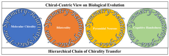 The new millennium in evolutionary science is characterized by fast advances in the view of the human brain–body laterality (handedness). Initially, many thought that left–right laterality (handedness) is an essential aspect of human brain organization, the basis of which is poorly understood []. In parallel, a complementary view was unfolding that during biological evolution, from om early bilaterians to extant humans, the brain exhibited a set of significant milestones of reorganization that enabled advanced adaptive behaviors. They are steering (taxis navigation), reinforcing (model-free reinforcement learning), simulating (model-based reinforcement learning), mentalizing (model of mind), and speaking (rhythmic semantic processing) []. Recently, many expressed a cautious assumption that “symmetries may have their origin in fundamental molecular asymmetries going far back in biological evolution []. Under the pressure of experimental evidence and looking at the roots and top of the evolutionary tree, we can bring this assumption to a more definite statement: lateralization of brain morphology and functions are the result of evolutionary selection having origin in fundamental molecular asymmetries and not less indispensable space–time symmetry of environment [].