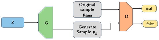 GANs, proposed by Goodfellow et al. [24] in 2014, are unsupervised generative models that offer solutions for data augmentation and data imbalances. The underlying principle of the model is rooted in the concept of zero-sum game theory. The entire network primarily comprises two network modules: the generator (G) and the discriminator (D). The G is tasked with acquiring knowledge about the feature distribution within the known data space and generating new samples based on the learned feature distributions. On the other hand, the D functions as a binary classification network, examining the disparities between the real samples and the generated samples. The model engages in a continuous adversarial process, with the G and D constantly opposing each other. Through iterative optimization using the back-propagation of the loss function, the two neural network modules strive to achieve the Nash equilibrium, at which point neither module can improve its performance without affecting the other. The GAN model framework is shown in Figure 1.